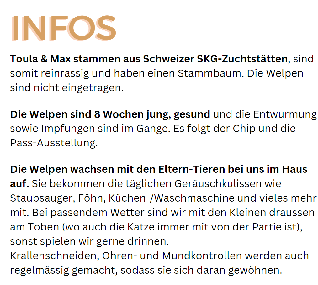 ❤ Welpen – Seit dem 4. Juli 2023 sind Toula & Max Eltern von 3 Mädchen und einem Jungen. Sie schlagen sich ganz gut. Toben zusammen, erziehen die Kleinen und sorgen auch für ihre wichtige Me-Time… dann springen die Grosseltern ein, also wir 🙂